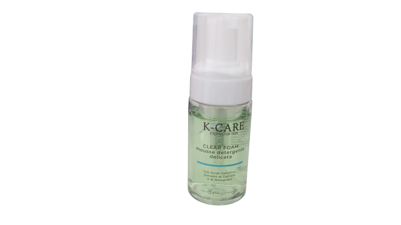 K-Care Clear Foam mousse detergente delicata con Acido Salicilico, estratto di cetriolo e di melograno.